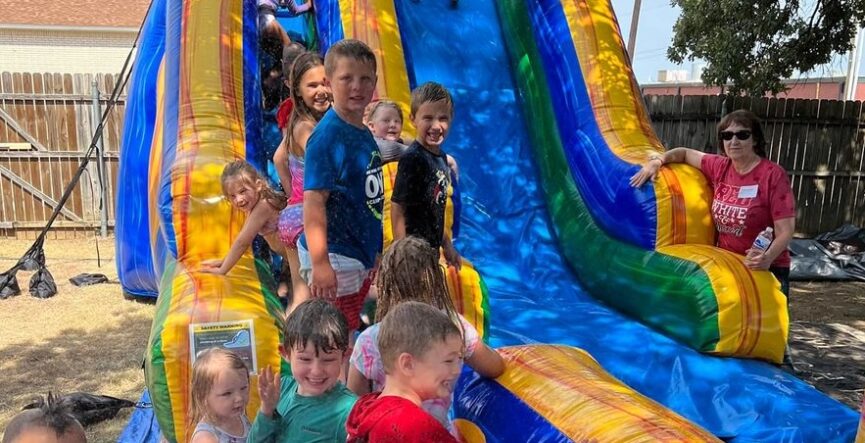 Kids come to church prepared to go to class for a creative lesson and then taken to the Backyard for a fun time splashing in a splash pool, playing water games, and sliding down a giant water slide.